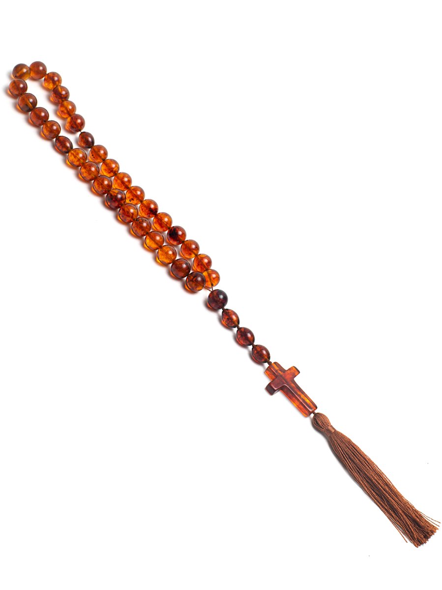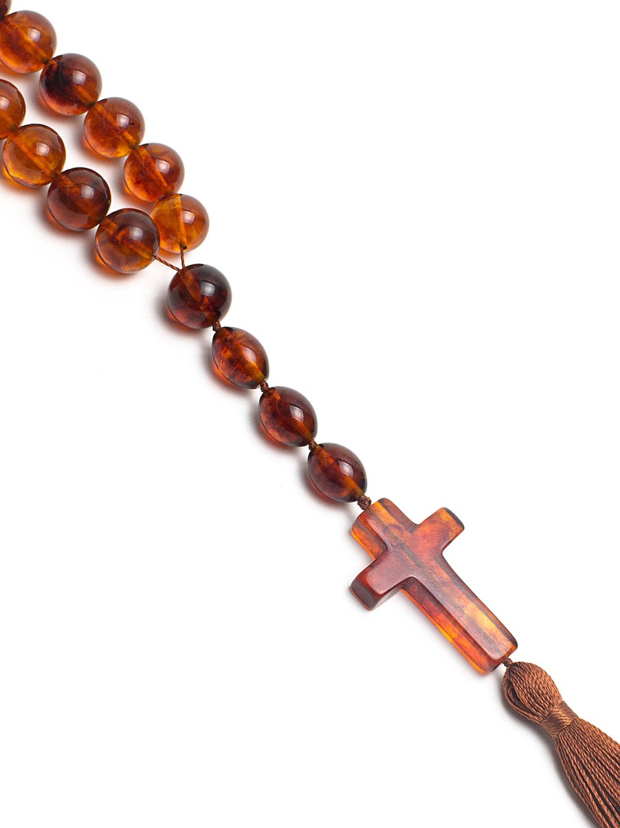 The Confessional spiritual Orthodox Amber rosary is designed for deep prayer practice. These cognac amber rosaries are made of natural Baltic amber of a noble shade. Perfectly polished beads with a diameter of 10 mm provide tactile comfort when brushing. The sacral completeness of these Orthodox rosaries is given by a one-piece cognac cross with a traditional tail, emphasizing the spiritual purpose of the accessory.